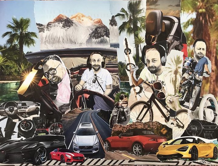 ‘Remi the test-driver’. Pre car accident my brother was a test driver for Audi. He was sent to various places for test drives in different weather conditions. Hence the palms (Barcelona) and the mountains (Alps) on this collage. This artwork being a souvenir of the job he was very passionate about.